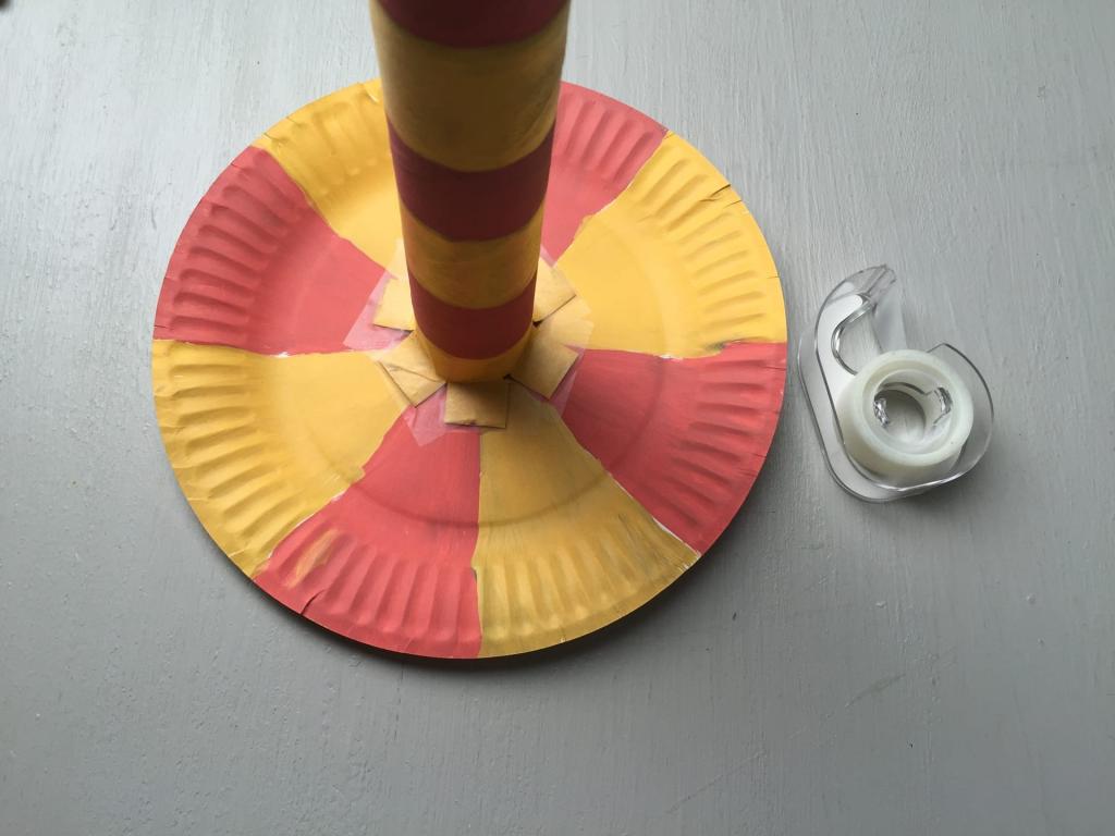 Lastly, once your base plate and the tube are dry, cut 4 to 6 slits that are about 1.5 cm long, on the bottom of the tube. Fold the tabs outward and tape them down onto the base plate. Your ring toss stand is complete!